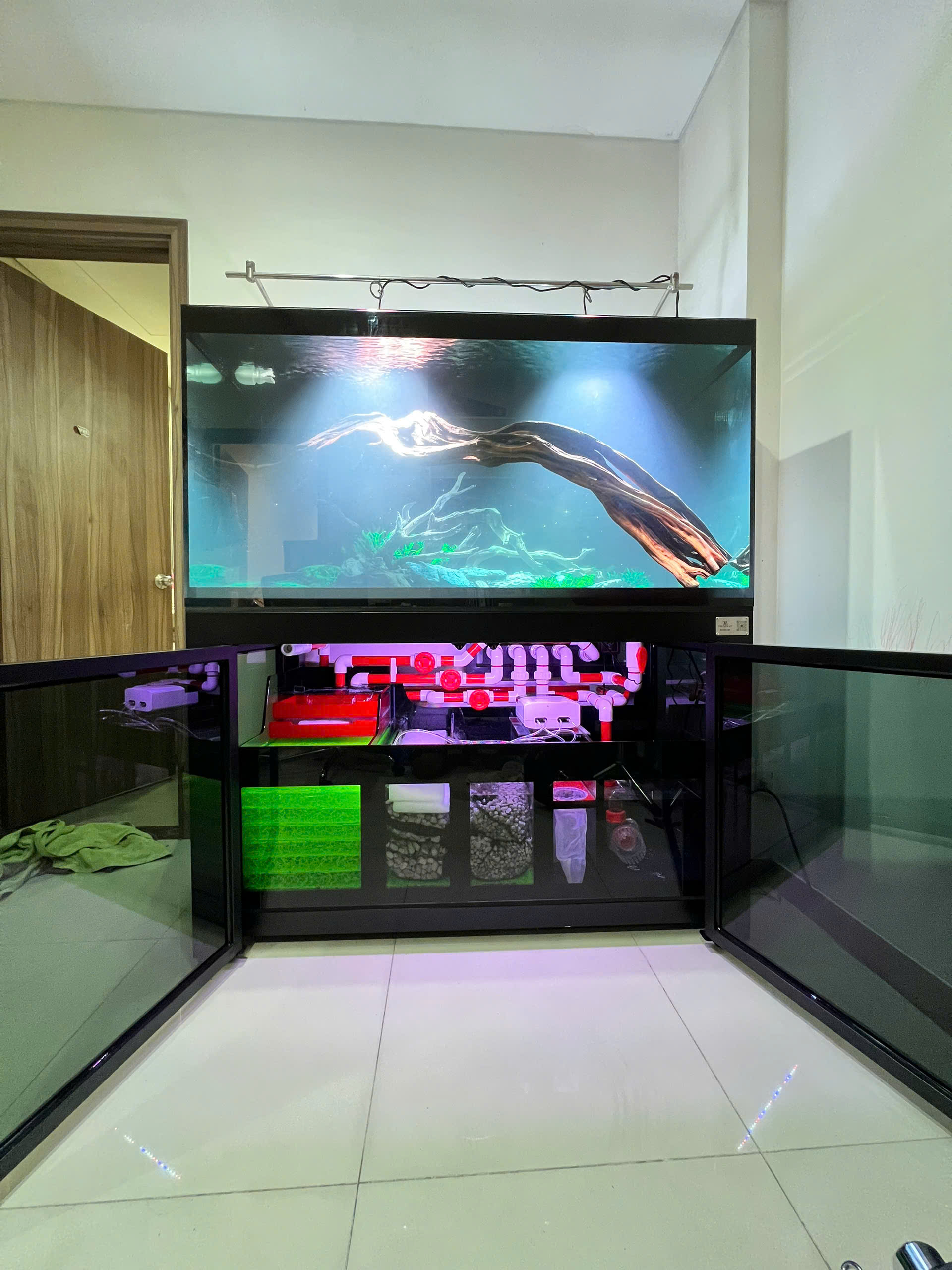 Như hình ảnh sản phẩm, toàn bộ “trái tim kỹ thuật” của bể cá được giấu kín sau cánh cửa tủ. Đây là giải pháp thẩm mỹ tối thượng, đảm bảo bể chính của bạn không có bất kỳ thiết bị nào (bơm, sưởi, ống lọc).