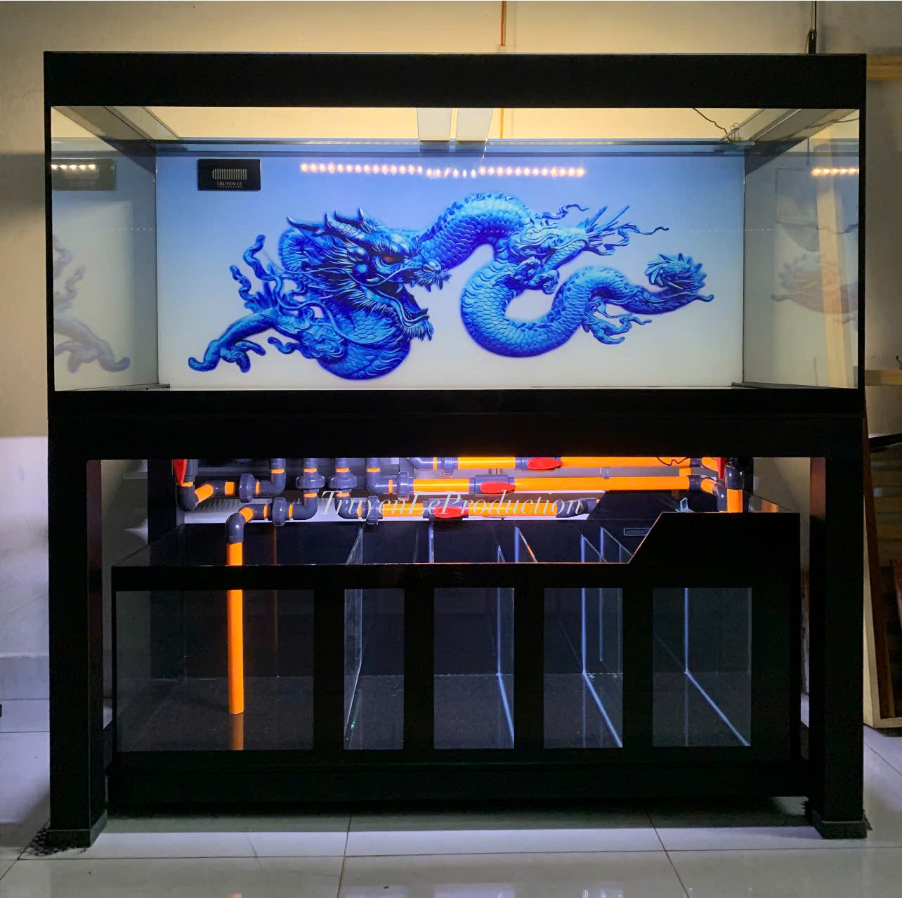 Chiêm ngưỡng Long Mạch Tụ Vượng. Bể cá phong thủy 3D Thanh Long (Rồng Xanh), phô diễn lọc tràn dưới (sump) công nghệ cao. Hùng Long chuyên setup hồ cá rồng.