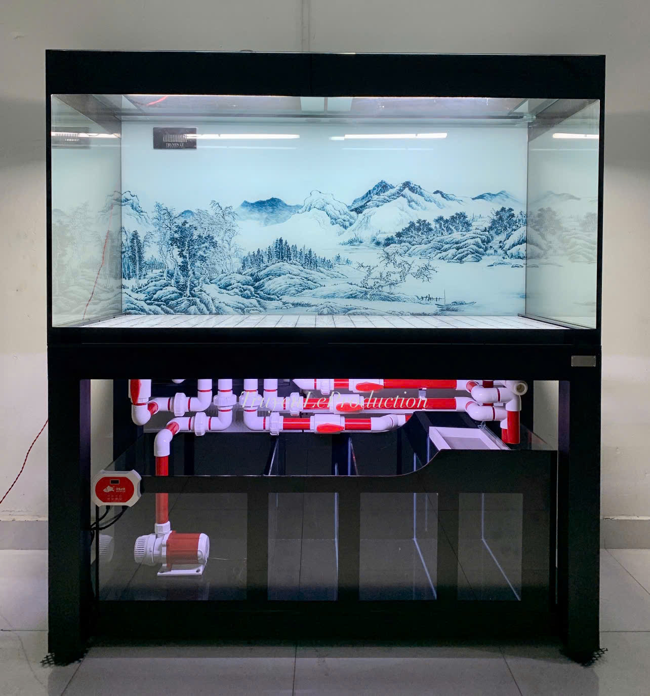 - Bể Kính Siêu Trong (Ultra-Clear Glass): Bắt buộc phải dùng kính siêu trong (kính pha lê) để nền trắng-xanh không bị ám xanh, đảm bảo bức tranh thủy mặc được hiển thị chân thực nhất.